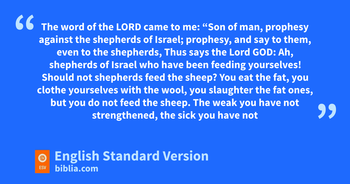 34 The word of the Lord came to me: 2 d“Son of man, prophesy against the shepherds of Israel; prophesy, and say to them, even to the shepherds, Thus says the Lord God: eAh, shepherds of Israel fwho have been feeding yourselves! gShould not shepherds feed the sheep? 3 hYou eat the fat, you clothe yourselves with the wool, iyou slaughter the fat ones, but you do not feed the sheep. 4 jThe weak you have not strengthened, the sick you have not healed, hthe injured you have not bound up, hthe strayed you have not brought back, kthe lost you have not sought, and with force and lharshness you have ruled them. 5 mSo they were scattered, because there was no shepherd, and nthey became food for all the wild beasts. My sheep were scattered; 6 they wandered over all the mountains and on every high hill. My sheep were scattered over all the face of the earth, owith none to search or seek for them.