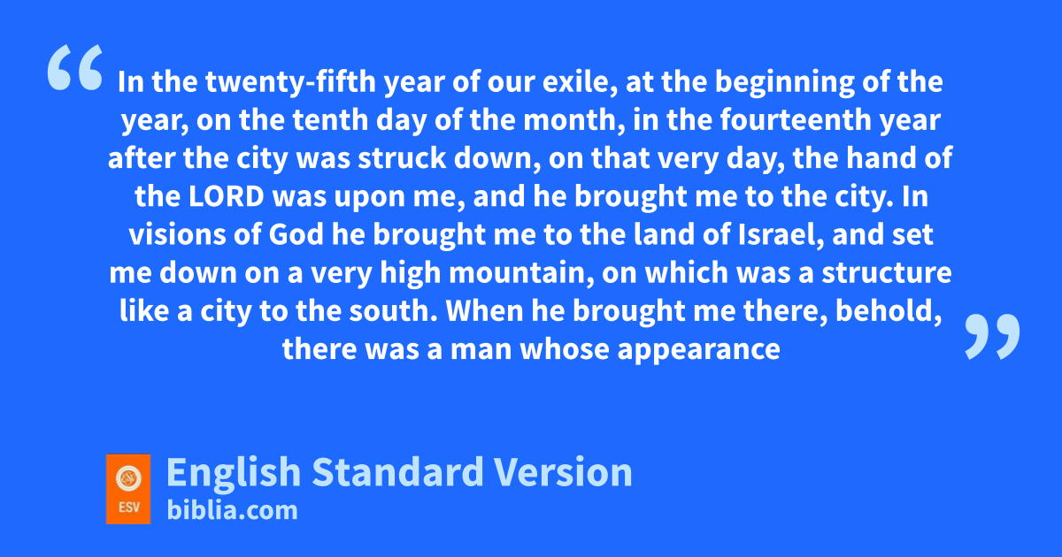 40 wIn the twenty-fifth year xof our exile, at the beginning of the year, on the tenth day of the month, yin the fourteenth year after the city was struck down, on that very day, zthe hand of the Lord was upon me, and he brought me to the city.1 2 In avisions of God he brought me to the land of Israel, and set me down on ba very high mountain, on which was a structure like a city to the south. 3 When he brought me there, behold, there was ca man whose appearance was dlike bronze, with ea linen cord and fa measuring reed in his hand. And he was standing in the gateway. 4 And the man said to me, g“Son of man, hlook with your eyes, and hhear with your ears, and set your heart upon all that I shall show you, for you were brought here in order that I might show it to you. iDeclare all that you see to the house of Israel.”