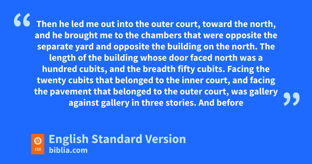 42 Then he led me out into xthe outer court, ytoward the north, and he brought me to xthe chambers that were opposite zthe separate yard and opposite athe building on the north. 2 The length of the building whose door faced north was ba hundred cubits,1 and cthe breadth fifty cubits. 3 Facing dthe twenty cubits that belonged to the inner court, and facing ethe pavement that belonged to the outer court, was fgallery2 against gallery in three stories. 4 And gbefore the chambers was a passage inward, ten cubits wide and ha hundred cubits long,3 and gtheir doors were on the north. 5 Now the upper chambers were narrower, for the galleries took more away from them than from the lower and middle chambers of the building. 6 For they were in three stories, and they had no pillars like the pillars of the courts. Thus the upper chambers were set back from the ground more than the lower and the middle ones. 7 And ithere was a wall outside parallel to the chambers, toward the outer court, opposite the chambers, jfifty cubits long. 8 For the chambers on the outer court were fifty cubits long, while those opposite kthe nave4 were la hundred cubits long. 9 Below these chambers was man entrance on the east side, as one enters them from the outer court.