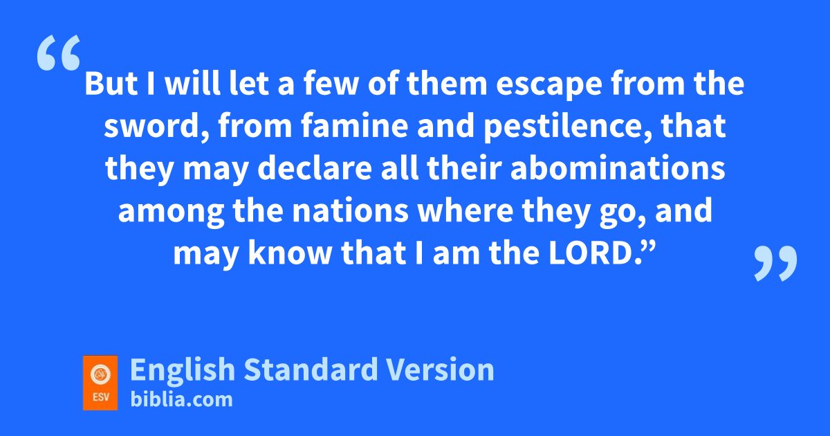 8 In the morning the word of the Lord came to me: 9 u“Son of man, has not the house of Israel, vthe rebellious house, said to you, w‘What are you doing?’ 10 Say to them, ‘Thus says the Lord God: This oracle concerns2 xthe prince in Jerusalem and all the house of Israel who are in it.’3 11 Say, y‘I am a sign for you: zas I have done, so shall it be done to them. They shall go into exile, into captivity.’ 12 aAnd the prince who is among them shall lift his baggage upon his shoulder at dusk, and shall go out. bThey shall dig through the wall to bring him out through it. cHe shall cover his face, that he may not see the land with his eyes. 13 dAnd I will spread my net over him, and he shall be taken in my snare. And eI will bring him to Babylon, the land of the Chaldeans, eyet he shall not see it, and he shall die there. 14 fAnd I will scatter toward every wind all who are around him, his helpers and all his troops, gand I will unsheathe the sword after them. 15 hAnd they shall know that I am the Lord, when I disperse them among the nations and scatter them among the countries. 16 iBut I will let a few of them escape from the sword, from famine and pestilence, that they may declare all their abominations among the nations where they go, jand may know that I am the Lord.”