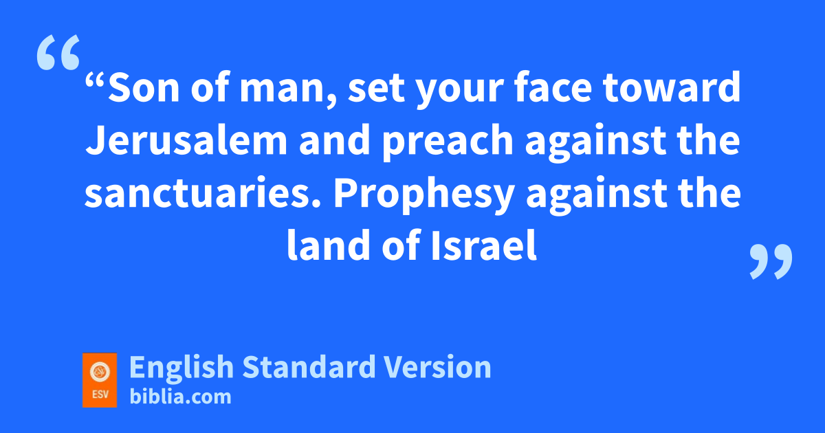21 1 The word of the Lord came to me: 2 t“Son of man, uset your face toward Jerusalem and vpreach against the sanctuaries.2 Prophesy against the land of Israel 3 and say to the land of Israel, Thus says the Lord: wBehold, I am against you and will draw xmy sword from its sheath and ywill cut off from you both righteous and wicked. 4 Because I will cut off from you both righteous and wicked, therefore my sword shall be drawn from its sheath against all flesh from south to north. 5 zAnd all flesh shall know that I am the Lord. I have drawn xmy sword from its sheath; ait shall not be sheathed again.