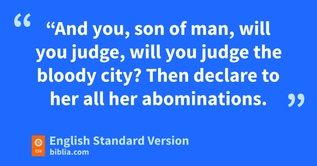 22 And the word of the Lord came to me, saying, 2 “And you, yson of man, zwill you judge, will you judge athe bloody city? bThen declare to her all her abominations. 3 You shall say, Thus says the Lord God: A city that sheds blood in her midst, so that cher time may come, and that makes idols to defile herself! 4 You have become guilty aby the blood that you have shed, and defiled by the idols that you have made, and you have brought cyour days near, the appointed time of1 your years has come. dTherefore I have made you a reproach to the nations, and a mockery to all the countries. 5 Those who are near and those who are far from you will mock you; eyour name is defiled; fyou are full of tumult.