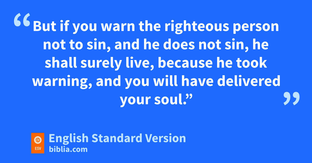16 sAnd at the end of seven days, the word of the Lord came to me: 17 t“Son of man, uI have made you a watchman for the house of Israel. Whenever you hear a word from my mouth, you shall vgive them warning from me. 18 wIf I say to the wicked, x‘You shall surely die,’ vand you give him no warning, nor speak to warn the wicked from his wicked way, in order to save his life, that wicked person yshall die for4 his iniquity, zbut his blood I will require at your hand. 19 aBut if you warn the wicked, and he does not turn from his wickedness, or from his wicked way, he shall die for his iniquity, bbut you cwill have delivered your soul. 20 dAgain, if a righteous person turns from his righteousness and commits injustice, eand I lay a stumbling block before him, he shall die. vBecause you have not warned him, he shall die for his sin, dand his righteous deeds that he has done shall not be remembered, zbut his blood I will require at your hand. 21 But if you warn the righteous person not to sin, and he does not sin, he shall surely live, because he took warning, and you will have delivered your soul.”