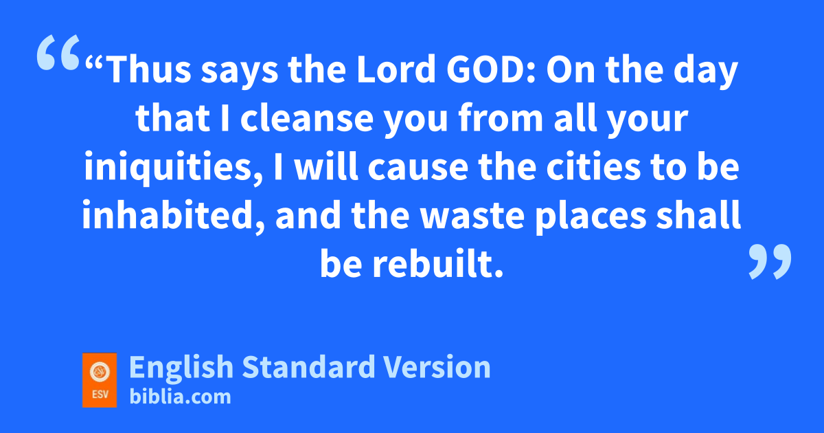 33 “Thus says the Lord God: On the day that sI cleanse you from all your iniquities, tI will cause the cities to be inhabited, and the waste places shall be rebuilt. 34 And the land that was desolate shall be tilled, instead of being the desolation that it was in the sight of all who passed by. 35 And they will say, ‘This land that was desolate has become like uthe garden of Eden, and the waste and desolate and ruined cities are now fortified and inhabited.’ 36 Then vthe nations that are left all around you shall know that I am the Lord; I have rebuilt the ruined places and wreplanted that which was desolate. xI am the Lord; I have spoken, and I will do it.