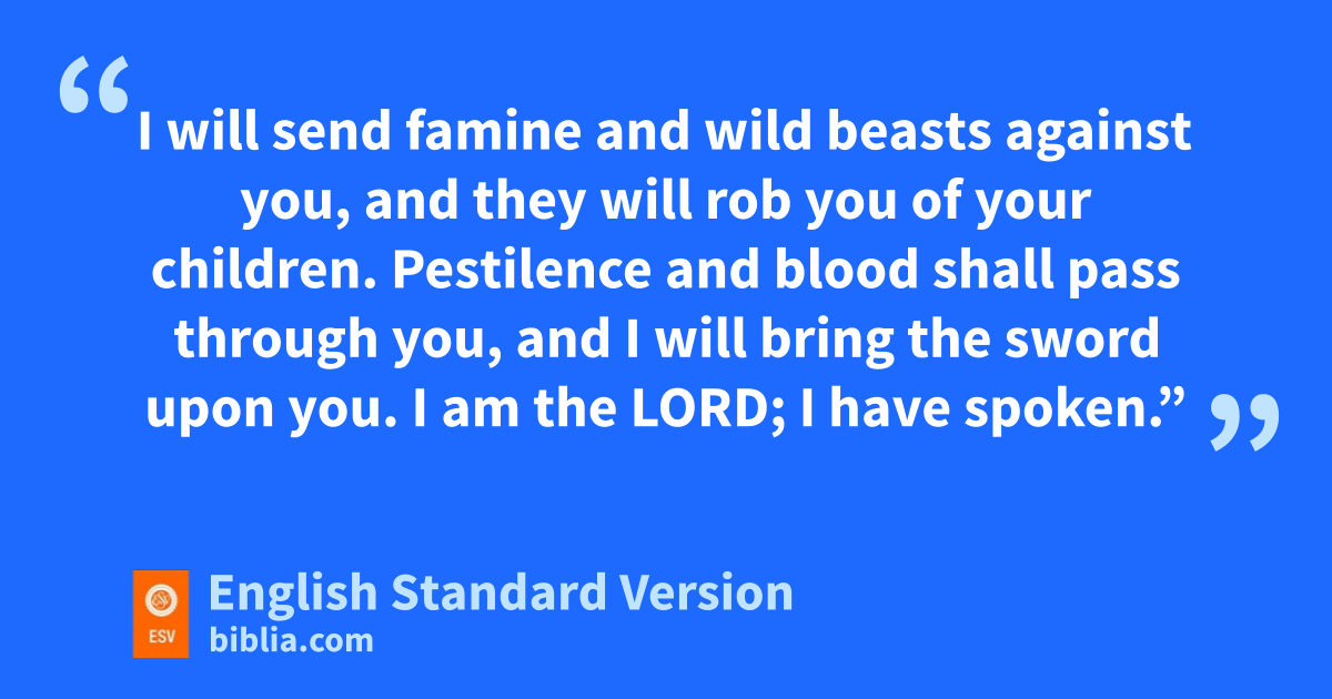 13 e“Thus shall my anger spend itself, and I will vent my fury upon them and satisfy myself. And they shall know that fI am the Lord—that I have spoken in my jealousy—ewhen I spend my fury upon them. 14 Moreover, I will make you ga desolation and han object of reproach among ithe nations all around you and in the sight of all who pass by. 15 You shall be4 a reproach and a taunt, a warning jand a horror, to ithe nations all around you, kwhen I execute judgments on you in anger and fury, and lwith furious rebukes—I am the Lord; I have spoken— 16 when I send against you5 mthe deadly arrows of famine, arrows for destruction, which I will send to destroy you, and when I bring more and more famine upon nyou and break your supply6 of bread. 17 I will send famine and owild beasts against you, pand they will rob you of your children. Pestilence and qblood shall pass through you, and I will bring the sword upon you. I am the Lord; I have spoken.”