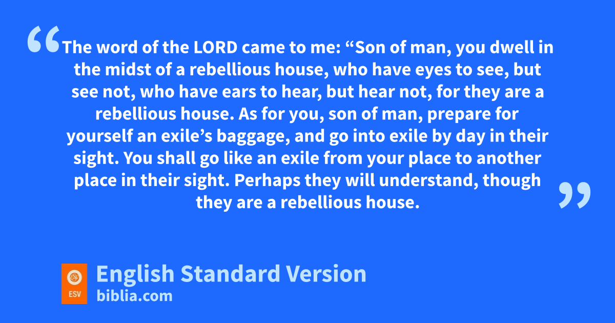 12 The word of the Lord came to me: 2 j“Son of man, you dwell in the midst of ka rebellious house, lwho have eyes to see, but see not, who have ears to hear, but hear not, for they are ka rebellious house. 3 As for you, son of man, prepare for yourself man exile’s baggage, and go into exile by day nin their sight. You shall go like an exile from your place to another place nin their sight. oPerhaps they will understand, though1 they are a rebellious house. 4 You shall bring out your baggage by day in their sight, as baggage for exile, and you shall go out yourself pat evening in their sight, as those do who must go into exile. 5 In their sight qdig through the wall, and bring your baggage out through it. 6 In their sight you shall lift the baggage upon your shoulder and carry it out at dusk. You shall cover your face that you may not see the land, for I have made you ra sign for the house of Israel.”