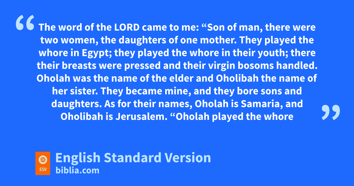 23 The word of the Lord came to me: 2 h“Son of man, there were itwo women, the daughters of one mother. 3 jThey played the whore in Egypt; jthey played the whore kin their youth; there their breasts were pressed and their virgin bosoms1 handled. 4 Oholah was the name of the elder and Oholibah the name of her sister. lThey became mine, and they mbore sons and daughters. As for their names, Oholah is nSamaria, and Oholibah is Jerusalem.