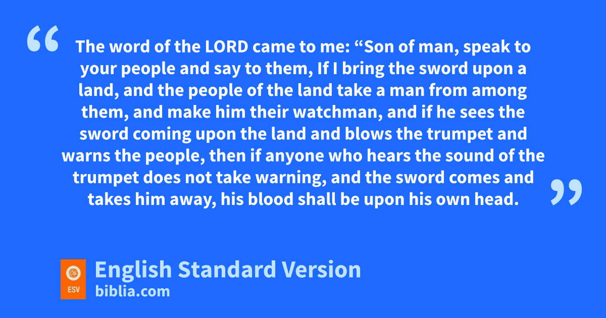 33 The word of the Lord came to me: 2 t“Son of man, speak to uyour people and say to them, If vI bring the sword upon a land, and the people of the land take a man from among them, and make him their wwatchman, 3 and if he sees the sword coming upon the land and xblows the trumpet and warns the people, 4 then if anyone who hears the sound of the trumpet does not take warning, and the sword comes and takes him away, yhis blood shall be upon his own head. 5 zHe heard the sound of the trumpet and did not take warning; his blood shall be upon himself. But if he had taken warning, he would have saved his life. 6 aBut if the watchman sees the sword coming and does not blow the trumpet, so that the people are not warned, and the sword comes and takes any one of them, athat person is taken away in his iniquity, but his blood I will require at the watchman’s hand.