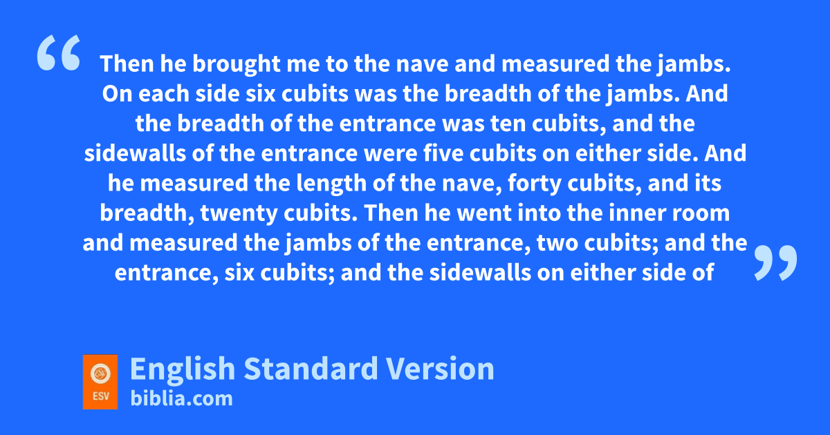 41 Then he brought me to mthe nave and measured the njambs. On each side six cubits1 was the breadth of the jambs.2 2 And the breadth of the entrance was ten cubits, and the sidewalls of the entrance were five cubits on either side. And he measured the length of the nave,3 oforty cubits, and its breadth, ptwenty cubits. 3 Then he went qinto the inner room and measured the jambs of the entrance, two cubits; and the entrance, six cubits; and the sidewalls on either side4 of the entrance, seven cubits. 4 And he measured rthe length of the room, twenty cubits, and its breadth, twenty cubits, across sthe nave. And he said to me, “This is tthe Most Holy Place.”