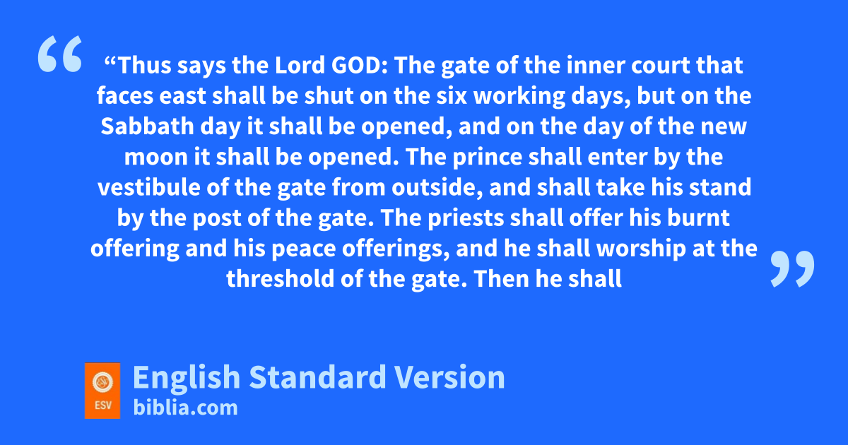 46 “Thus says the Lord God: pThe gate of qthe inner court that faces east shall be shut on the six working days, but on the Sabbath day it shall be opened, and ron the day of the new moon it shall be opened. 2 sThe prince shall enter by the vestibule of the gate from outside, and shall take his stand by tthe post of the gate. uThe priests shall offer his burnt offering and his peace offerings, and he shall worship at vthe threshold of the gate. Then he shall go out, but the gate shall not be shut until evening. 3 wThe people of the land shall bow down at the entrance of that gate before the Lord on the Sabbaths and on the new moons. 4 xThe burnt offering that the prince offers to the Lord yon the Sabbath day shall be six lambs without blemish and a ram without blemish. 5 And zthe grain offering with the ram shall be an ephah,1 and the grain offering with the lambs shall be aas much as he is able, together with a hin2 of oil to each ephah. 6 On the day of the new moon he shall offer a bull from the herd without blemish, and six lambs and a ram, which shall be without blemish. 7 As a grain offering he shall provide an ephah with the bull and an ephah with the ram, and with the lambs bas much as he is able, together with a hin of oil to each ephah. 8 cWhen the prince enters, he shall enter by the vestibule of the gate, and he shall go out by the same way.