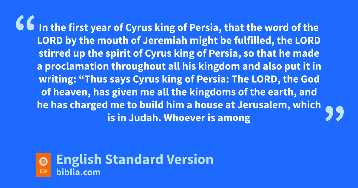 1 aIn the first year of Cyrus king of Persia, bthat the word of the Lord by the mouth of Jeremiah might be fulfilled, the Lord stirred up the spirit of Cyrus king of Persia, so cthat he made a proclamation throughout all his kingdom and also put it in writing: