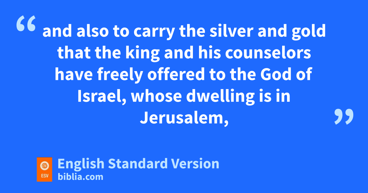 11 This is a copy of the letter that King Artaxerxes gave to Ezra the priest, the scribe, a man learned in matters of the commandments of the Lord and his statutes for Israel: 12 “Artaxerxes, fking of kings, to Ezra the priest, the gscribe of the Law of the God of heaven. Peace.2 hAnd now 13 iI make a decree that anyone of the people of Israel or their priests or Levites in my kingdom, who freely offers to go to Jerusalem, may go with you. 14 For you are sent by the king jand his seven counselors to make inquiries about Judah and Jerusalem according to the Law of your God, which is in your hand, 15 and also to carry the silver and gold that the king jand his counselors have freely offered to the God of Israel, kwhose dwelling is in Jerusalem, 16 lwith all the silver and gold that you shall find in the whole province of Babylonia, and mwith the freewill offerings of the people and the priests, vowed willingly for the house of their God that is in Jerusalem. 17 With this money, then, you shall with all diligence buy bulls, rams, and lambs, with their grain offerings and their drink offerings, and nyou shall offer them on the altar of the house of your God that is in Jerusalem. 18 Whatever seems good to you and your brothers to do with the rest of the silver and gold, you may do, according to the will of your God. 19 The vessels that have been given you for the service of the house of your God, you shall deliver before the God of Jerusalem. 20 And whatever else is required for the house of your God, which it falls to you to provide, you may provide it out of the king’s treasury.