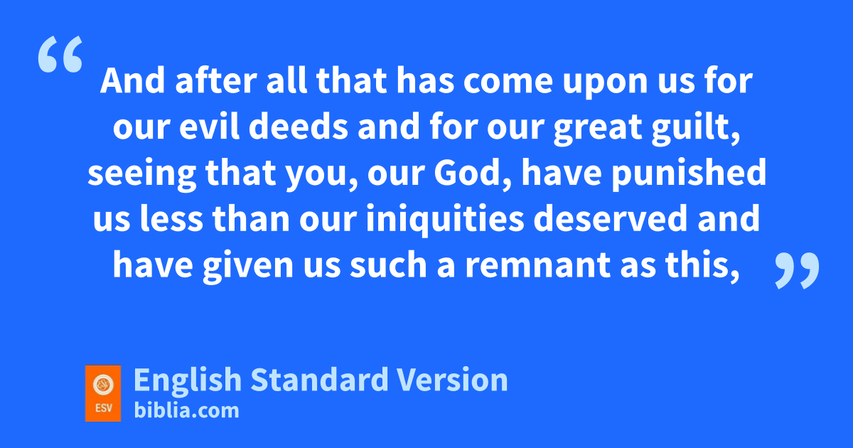 “O my God, I am ashamed and blush to lift my face to you, my God, for our iniquities phave risen higher than our heads, and our qguilt has rmounted up to the heavens. 7 sFrom the days of our fathers to this day we have been in great qguilt. And for our iniquities we, our kings, and our priests have been given into the hand of the kings of the lands, to the sword, to captivity, to plundering, tand to utter shame, as it is today. 8 But now for a brief moment favor has been shown by the Lord our God, to leave us a uremnant and to give us a vsecure hold2 within his holy place, that our God may wbrighten our eyes and grant us a little reviving in our slavery. 9 xFor we are slaves. Yet our God has not forsaken us in our slavery, ybut has extended to us his steadfast love before the kings of Persia, to grant us some reviving to set up the house of our God, to repair its ruins, and to give us protection3 in Judea and Jerusalem.