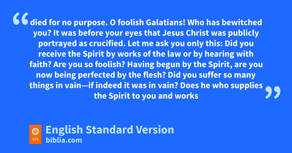 3 O foolish Galatians! Who has bewitched you? zIt was before your eyes that Jesus Christ was publicly aportrayed as crucified. 2 Let me ask you only this: bDid you receive the Spirit by works of the law or by chearing with faith? 3 Are you so foolish? dHaving begun by the Spirit, are you now being perfected by1 the flesh? 4 eDid you suffer2 so many things in vain—if indeed it was in vain? 5 Does he who supplies the Spirit to you and fworks miracles among you do so gby works of the law, or by hearing with faith— 6 just as hAbraham “believed God, and it was counted to him as righteousness”?