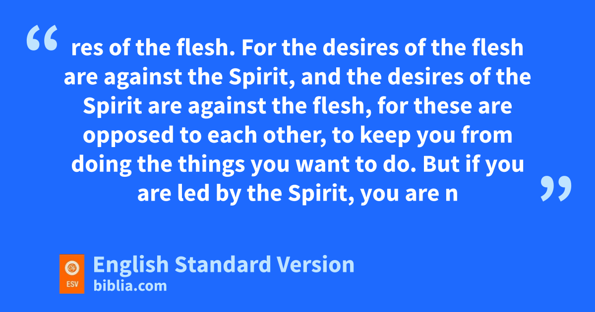 16 But I say, vwalk by the Spirit, and you will not gratify wthe desires of the flesh. 17 For xthe desires of the flesh are against the Spirit, and the desires of the Spirit are against the flesh, for these are opposed to each other, yto keep you from doing the things you want to do. 18 But if you are zled by the Spirit, ayou are not under the law. 19 Now bthe works of the flesh are evident: sexual immorality, impurity, sensuality, 20 idolatry, sorcery, enmity, strife, jealousy, fits of anger, rivalries, dissensions, cdivisions, 21 envy,4 drunkenness, orgies, and things like these. I warn you, as I warned you before, that dthose who do5 such things will not inherit the kingdom of God. 22 But ethe fruit of the Spirit is flove, joy, peace, patience, gkindness, goodness, faithfulness, 23 hgentleness, iself-control; jagainst such things there is no law. 24 And those who belong to Christ Jesus khave crucified the flesh with its lpassions and desires.