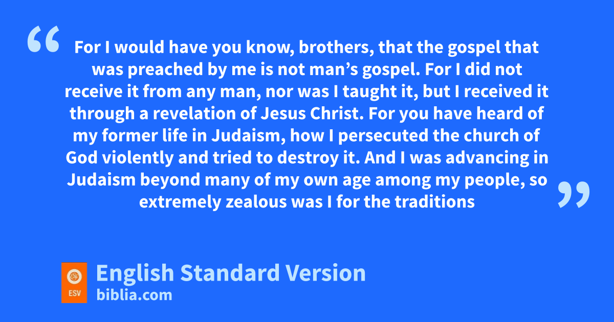 11 For uI would have you know, brothers, that vthe gospel that was preached by me is not man’s gospel.3 12 wFor I did not receive it from any man, nor was I taught it, but I received it xthrough a revelation of Jesus Christ. 13 For you have heard of ymy former life in Judaism, how zI persecuted the church of God violently and tried to destroy it. 14 And I was advancing in Judaism beyond many of my own age among my people, so extremely azealous was I for bthe traditions of my fathers. 15 But when he cwho had set me apart dbefore I was born,4 and who ecalled me by his grace, 16 was pleased to reveal his Son to5 me, in order fthat I might preach him among the Gentiles, I did not immediately consult with anyone;6 17 nor did I go up to Jerusalem to those who were apostles before me, but I went away into Arabia, and returned again to Damascus.