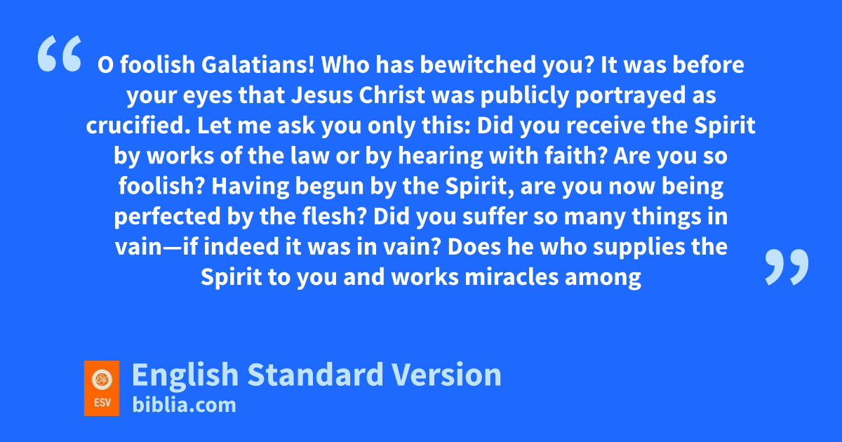 3 O foolish Galatians! Who has bewitched you? zIt was before your eyes that Jesus Christ was publicly aportrayed as crucified. 2 Let me ask you only this: bDid you receive the Spirit by works of the law or by chearing with faith? 3 Are you so foolish? dHaving begun by the Spirit, are you now being perfected by1 the flesh? 4 eDid you suffer2 so many things in vain—if indeed it was in vain? 5 Does he who supplies the Spirit to you and fworks miracles among you do so gby works of the law, or by hearing with faith— 6 just as hAbraham “believed God, and it was counted to him as righteousness”?