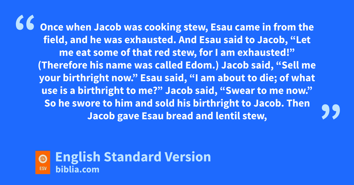 29 Once when Jacob was cooking stew, Esau came in from the field, and he was exhausted. 30 And Esau said to Jacob, “Let me eat some of that red stew, for I am exhausted!” (Therefore his name was called Edom.5) 31 Jacob said, “Sell me your birthright now.” 32 Esau said, “I am about to die; of what use is a birthright to me?” 33 Jacob said, “Swear to me now.” So he swore to him and tsold his birthright to Jacob. 34 Then Jacob gave Esau bread and lentil stew, and he ate and drank and rose and went his way. Thus Esau despised his birthright.