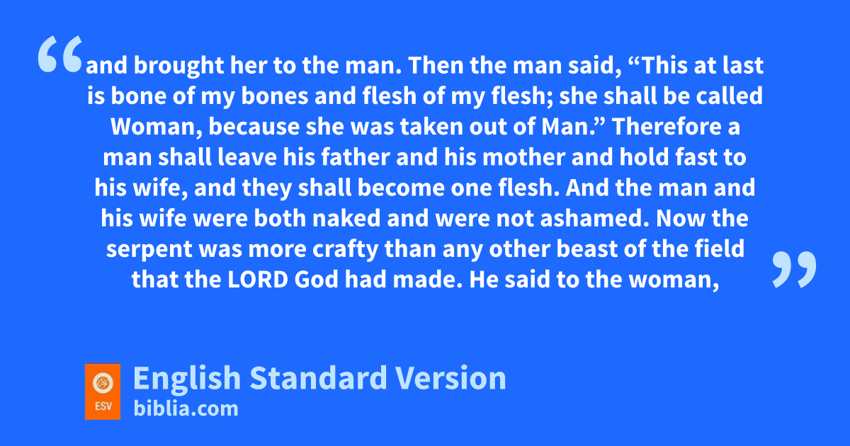 He said to the woman, “Did God actually say, ‘You1 shall not eat of any tree in the garden’?” 2 And the woman said to the serpent, “We may eat of the fruit of the trees in the garden, 3 but God said, v‘You shall not eat of the fruit of the tree that is in the midst of the garden, neither shall you touch it, lest you die.’ ” 4 wBut the serpent said to the woman, “You will not surely die. 5 For God knows that when you eat of it your eyes will be opened, and you will be like God, knowing good and evil.” 6 So when the woman saw that the tree was good for food, and that it was a delight to the eyes, and that the tree was to be desired to make one wise,2 she took of its fruit xand ate, and she also gave some to her husband who was with her, yand he ate. 7 zThen the eyes of both were opened, aand they knew that they were naked. And they sewed fig leaves together and made themselves loincloths.