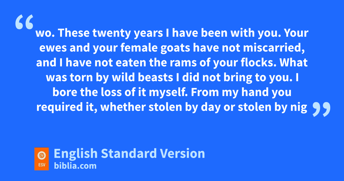 36 Then Jacob became angry and berated Laban. Jacob said to Laban, “What is my offense? What is my sin, that you have hotly pursued me? 37 For you have felt through all my goods; what have you found of all your household goods? Set it here before my kinsmen and byour kinsmen, that they may decide between us two. 38 These twenty years I have been with you. Your ewes and your female goats have not miscarried, and I have not eaten the rams of your flocks. 39 What was torn by wild beasts I did not bring to you. I bore the loss of it myself. cFrom my hand you required it, whether stolen by day or stolen by night. 40 There I was: by day the heat consumed me, and the cold by night, and my sleep fled from my eyes. 41 These twenty years I have been in your house. dI served you fourteen years for your two daughters, and six years for your flock, and eyou have changed my wages ten times. 42 fIf the God of my father, the God of Abraham and the gFear of Isaac, had not been on my side, surely now you would have sent me away empty-handed. hGod saw my affliction and the labor of my hands and irebuked you last night.”