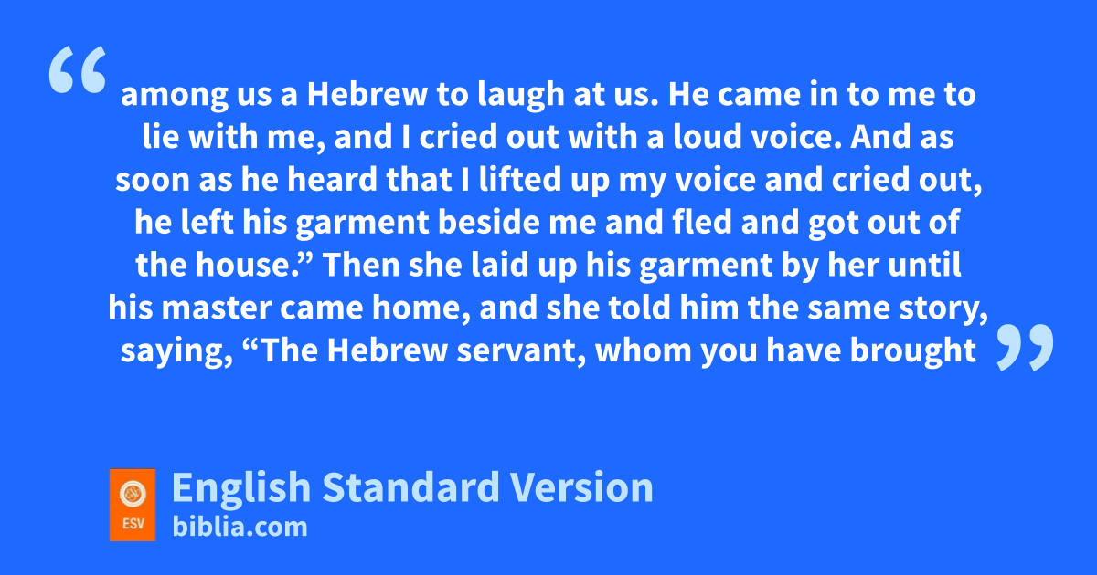 11 But one day, when he went into the house to do his work and none of the men of the house was there in the house, 12 xshe caught him by his garment, saying, “Lie with me.” But he left his garment in her hand and fled and got out of the house. 13 And as soon as she saw that he had left his garment in her hand and had fled out of the house, 14 she called to the men of her household and said to them, “See, he has brought among us a Hebrew to laugh at us. He came in to me to lie with me, and I cried out with a loud voice. 15 And as soon as he heard that I lifted up my voice and cried out, he left his garment beside me and fled and got out of the house.” 16 Then she laid up his garment by her until his master came home, 17 and she told him the same story, saying, “The Hebrew servant, whom you have brought among us, came in to me to laugh at me. 18 But as soon as I lifted up my voice and cried, he left his garment beside me and fled out of the house.”