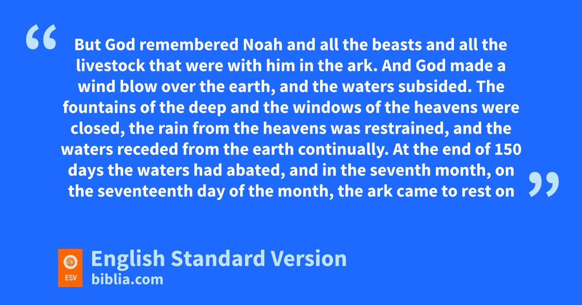 8 But God dremembered Noah and all the beasts and all the livestock that were with him in the ark. And eGod made a wind blow over the earth, and the waters subsided. 2 fThe fountains of the deep and fthe windows of the heavens were closed, the rain from the heavens was restrained, 3 and the waters receded from the earth continually. At the end gof 150 days the waters had abated, 4 and in the seventh month, on the seventeenth day of the month, the ark came to rest on the mountains of hArarat. 5 And the waters continued to abate until the tenth month; in the tenth month, on the first day of the month, the tops of the mountains were seen.