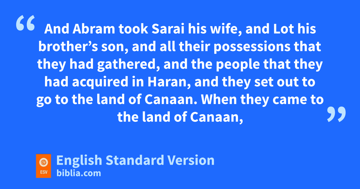 4 So Abram went, as the Lord had told him, and Lot went with him. Abram was seventy-five years old when he departed from qHaran. 5 And Abram took Sarai his wife, and Lot his brother’s son, and all their possessions that they had gathered, and the people that they had acquired in Haran, and they set out to go to the land of Canaan. When they came to the land of Canaan, 6 Abram rpassed through the land to the place at Shechem, to sthe oak4 of tMoreh. At that time uthe Canaanites were in the land. 7 Then the Lord appeared to Abram and said, v“To your offspring I will give this land.” So he built there an altar to the Lord, who had appeared to him. 8 From there he moved to the hill country on the east of wBethel and pitched his tent, with Bethel on the west and Ai on the east. And there he built an altar to the Lord and called upon the name of the Lord. 9 And Abram journeyed on, still going toward the Negeb.