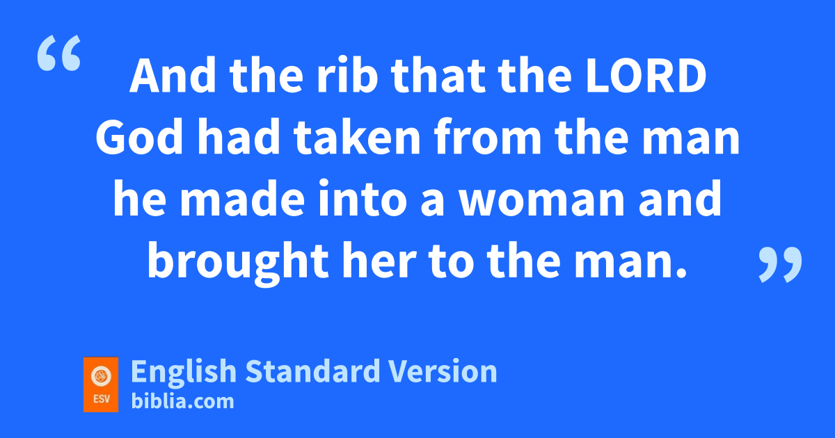 18 Then the Lord God said, “It is not good that the man should be alone; nI will make him a helper fit for5 him.” 19 oNow out of the ground the Lord God had formed6 every beast of the field and every bird of the heavens and pbrought them to the man to see what he would call them. And whatever the man called every living creature, that was its name. 20 The man gave names to all livestock and to the birds of the heavens and to every beast of the field. But for Adam7 there was not found a helper fit for him. 21 So the Lord God caused a qdeep sleep to fall upon the man, and while he slept took one of his ribs and closed up its place with flesh. 22 And the rib that the Lord God had taken from the man he made8 into a woman and brought her to the man. 23 Then the man said,