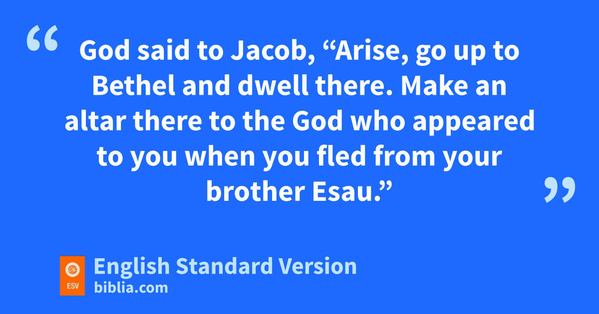 35 God said to Jacob, “Arise, go up to bBethel and dwell there. Make an altar there to the God who appeared to you cwhen you fled from your brother Esau.” 2 So Jacob said to his dhousehold and to all who were with him, “Put away ethe foreign gods that are among you and fpurify yourselves and change your garments. 3 Then let us arise and go up to Bethel, so that I may make there an altar to the God gwho answers me in the day of my distress and hhas been with me wherever I have gone.” 4 So they gave to Jacob all the foreign gods that they had, and the rings that were in their ears. Jacob hid them under ithe terebinth tree that was near Shechem.