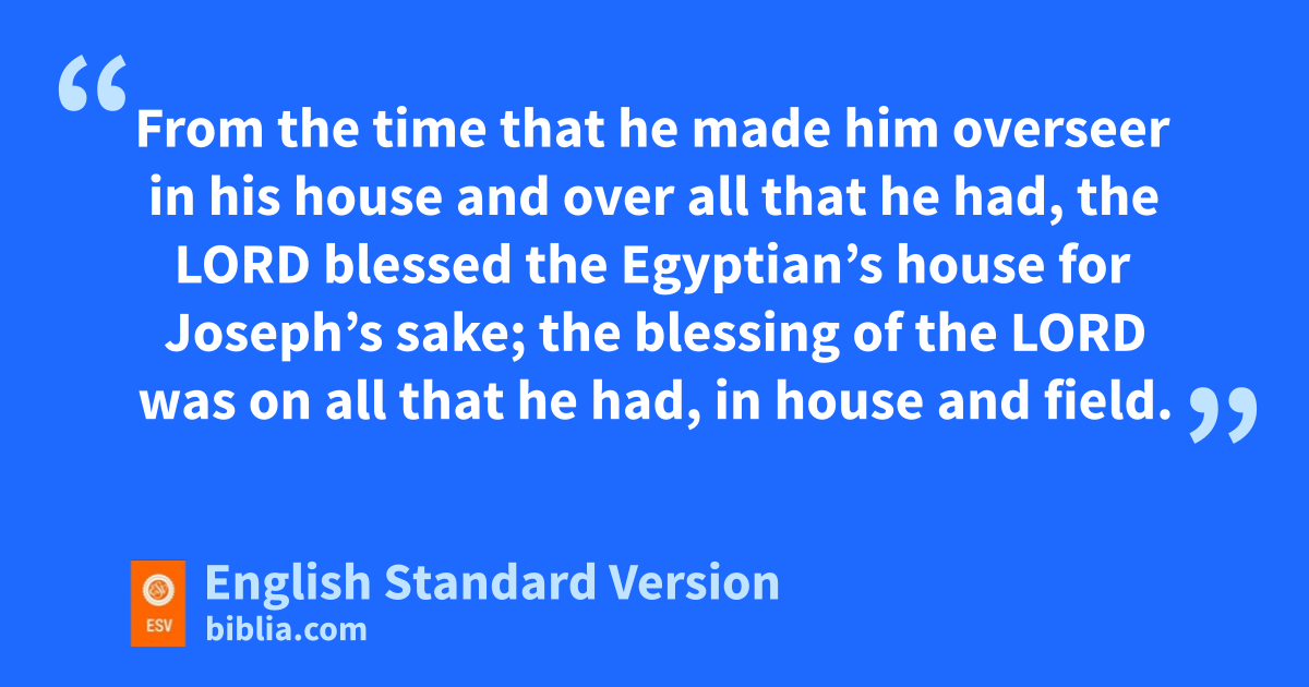39 Now Joseph had been brought down to Egypt, and lPotiphar, an officer of Pharaoh, the captain of the guard, an Egyptian, mhad bought him from the nIshmaelites who had brought him down there. 2 oThe Lord was with Joseph, and he became a successful man, and he was in the house of his Egyptian master. 3 His master saw that the Lord was with him and that the Lord pcaused all that he did to succeed in his hands. 4 So Joseph qfound favor in his sight and attended him, and he made him overseer of his house rand put him in charge of all that he had. 5 From the time that he made him overseer in his house and over all that he had, the Lord blessed the Egyptian’s house sfor Joseph’s sake; the blessing of the Lord was on all that he had, in house and field. 6 So he left all that he had in Joseph’s charge, and because of him he had no concern about anything but the food he ate.