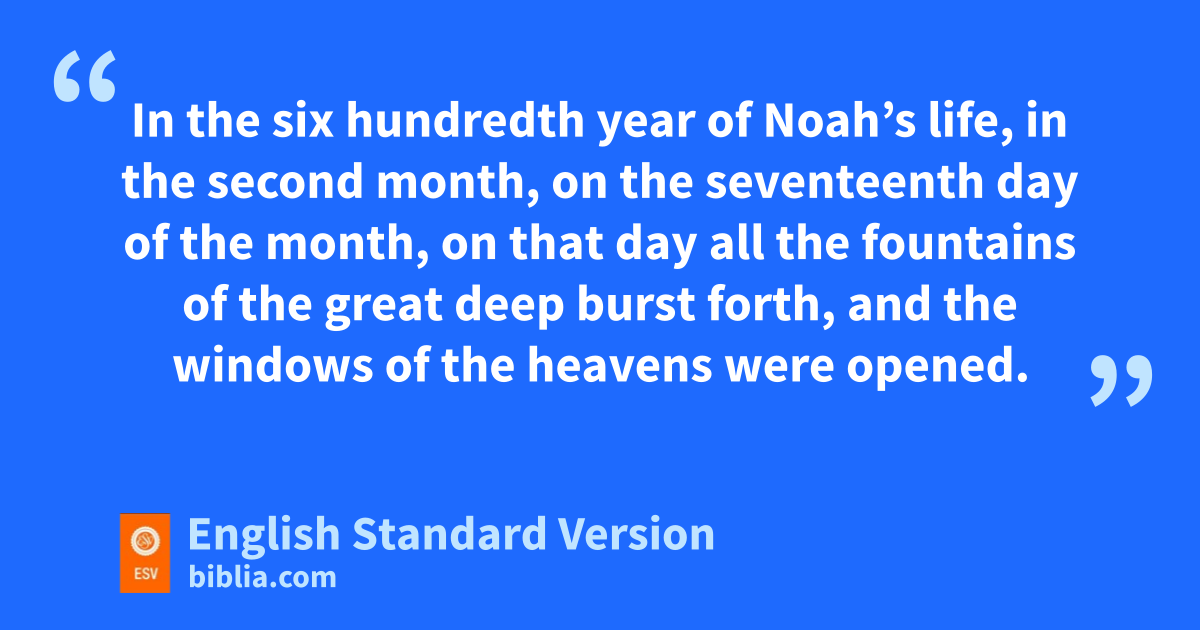 11 In the six hundredth year of Noah’s life, in the second month, on the seventeenth day of the month, on that day all the vfountains of the great deep burst forth, and wthe windows of the heavens were opened. 12 And rain fell upon the earth forty days and forty nights. 13 On the very same day Noah and his sons, Shem and Ham and Japheth, and Noah’s wife and the three wives of his sons with them entered the ark, 14 they and every beast, according to its kind, and all the livestock according to their kinds, and every creeping thing that creeps on the earth, according to its kind, and every bird, according to its kind, every winged creature. 15 They xwent into the ark with Noah, two and two of all flesh in which there was the breath of life. 16 And those that entered, male and female of all flesh, went in yas God had commanded him. And the Lord shut him in.