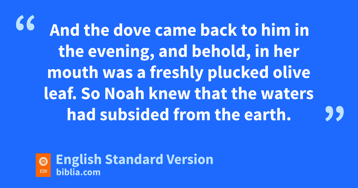 6 At the end of forty days Noah opened the window of the ark that he had made 7 and sent forth a raven. It went to and fro until the waters were dried up from the earth. 8 Then he sent forth a dove from him, to see if the waters had subsided from the face of the ground. 9 But the dove found no place to set her foot, and she returned to him to the ark, for the waters were still on the face of the whole earth. So he put out his hand and took her and brought her into the ark with him. 10 He waited another seven days, and again he sent forth the dove out of the ark. 11 And the dove came back to him in the evening, and behold, in her mouth was a freshly plucked olive leaf. So Noah knew that the waters had subsided from the earth. 12 Then he waited another seven days and sent forth the dove, and she did not return to him anymore.