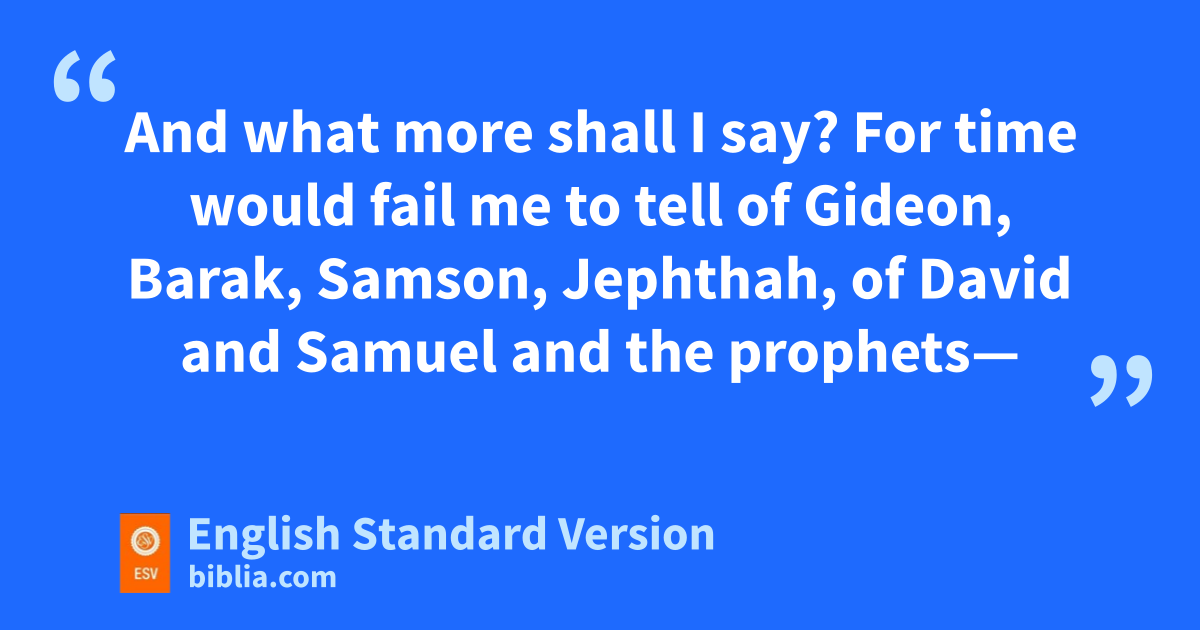 32 And what more shall I say? For time would fail me to tell of fGideon, gBarak, hSamson, iJephthah, of jDavid and kSamuel and the prophets— 33 who through faith conquered kingdoms, enforced justice, obtained promises, lstopped the mouths of lions, 34 mquenched the power of fire, escaped the edge of the sword, were made strong out of weakness, nbecame mighty in war, nput foreign armies to flight. 35 oWomen received back their dead by resurrection. Some were tortured, refusing to accept release, so that they might rise again to a better life. 36 Others suffered mocking and flogging, and even pchains and imprisonment. 37 qThey were stoned, they were sawn in two,1 rthey were killed with the sword. sThey went about in skins of sheep and goats, destitute, afflicted, mistreated— 38 of whom the world was not worthy—twandering about in deserts and mountains, and in dens and caves of the earth.