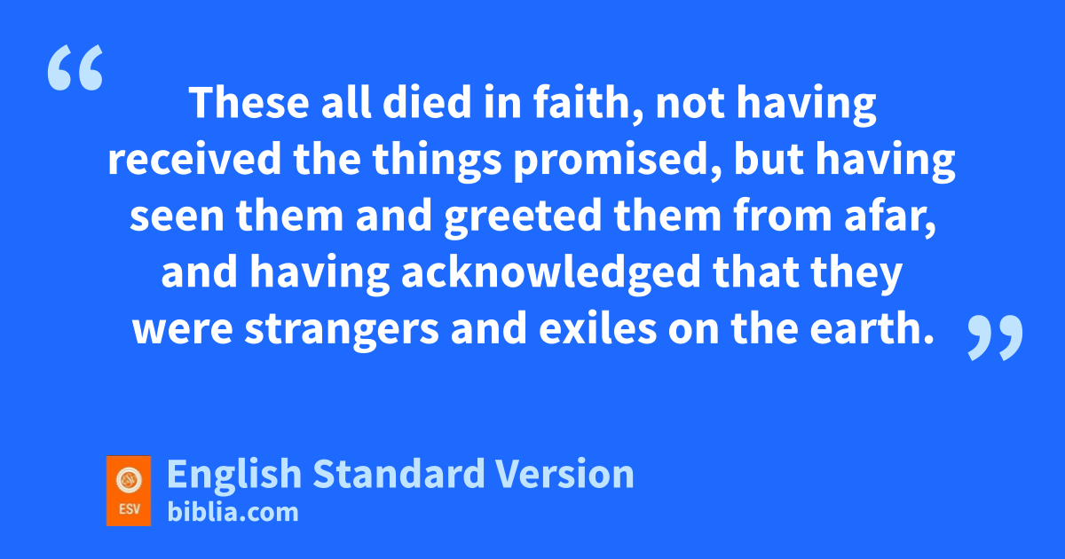 13 These all died in faith, cnot having received the things promised, but dhaving seen them and greeted them from afar, and ehaving acknowledged that they were fstrangers and exiles on the earth. 14 For people who speak thus make it clear that they are seeking a homeland. 15 If they had been thinking of that land from which they had gone out, gthey would have had opportunity to return. 16 But as it is, they desire a better country, that is, a heavenly one. Therefore God is not ashamed hto be called their God, for ihe has prepared for them a city.