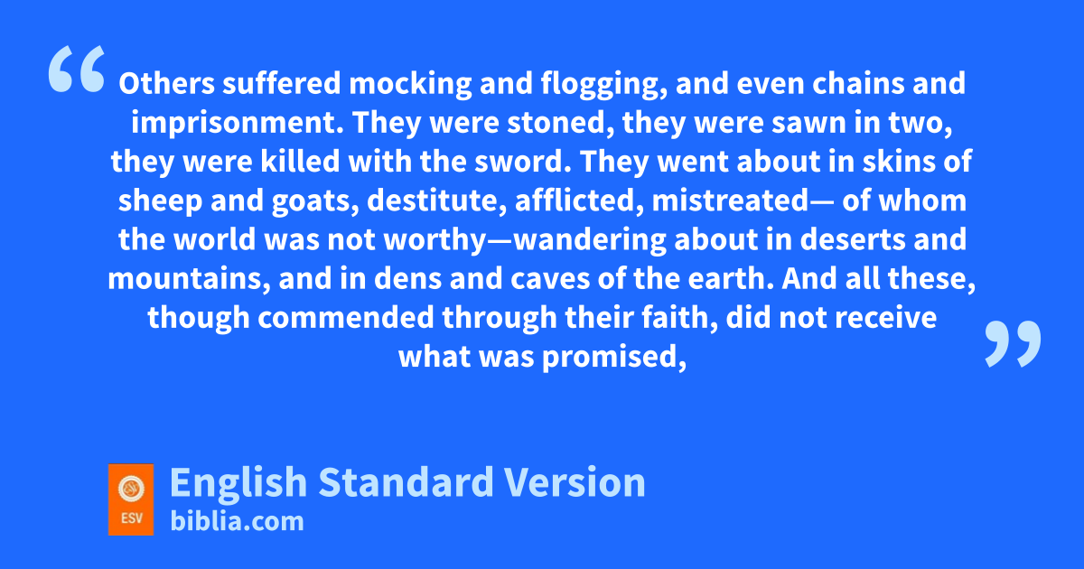 32 And what more shall I say? For time would fail me to tell of fGideon, gBarak, hSamson, iJephthah, of jDavid and kSamuel and the prophets— 33 who through faith conquered kingdoms, enforced justice, obtained promises, lstopped the mouths of lions, 34 mquenched the power of fire, escaped the edge of the sword, were made strong out of weakness, nbecame mighty in war, nput foreign armies to flight. 35 oWomen received back their dead by resurrection. Some were tortured, refusing to accept release, so that they might rise again to a better life. 36 Others suffered mocking and flogging, and even pchains and imprisonment. 37 qThey were stoned, they were sawn in two,1 rthey were killed with the sword. sThey went about in skins of sheep and goats, destitute, afflicted, mistreated— 38 of whom the world was not worthy—twandering about in deserts and mountains, and in dens and caves of the earth.