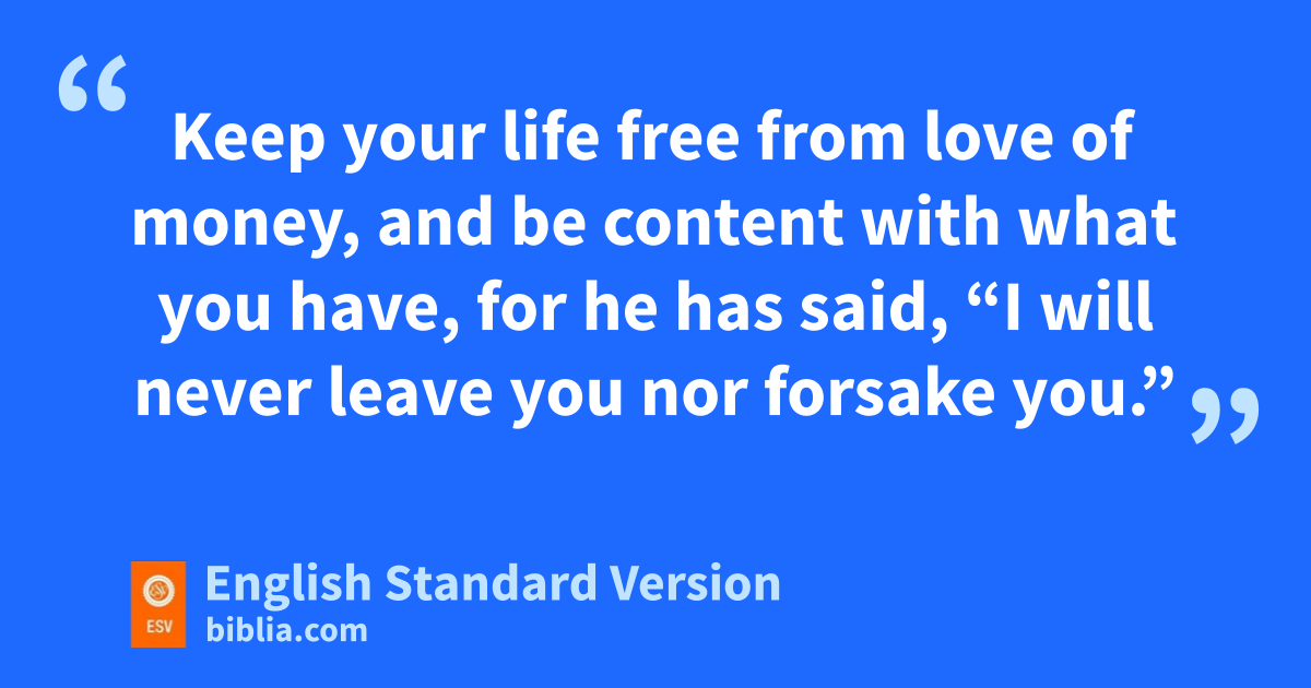 13 Let ubrotherly love continue. 2 vDo not neglect to show hospitality to strangers, for thereby wsome have entertained angels unawares. 3 xRemember those who are in prison, as though in prison with them, and those who are mistreated, since you also are in the body. 4 yLet marriage be held in honor among all, and let the marriage bed be undefiled, for God will judge zthe sexually immoral and adulterous. 5 Keep your life afree from love of money, and bbe content with what you have, for he has said, c“I will never leave you nor forsake you.” 6 So we can confidently say,