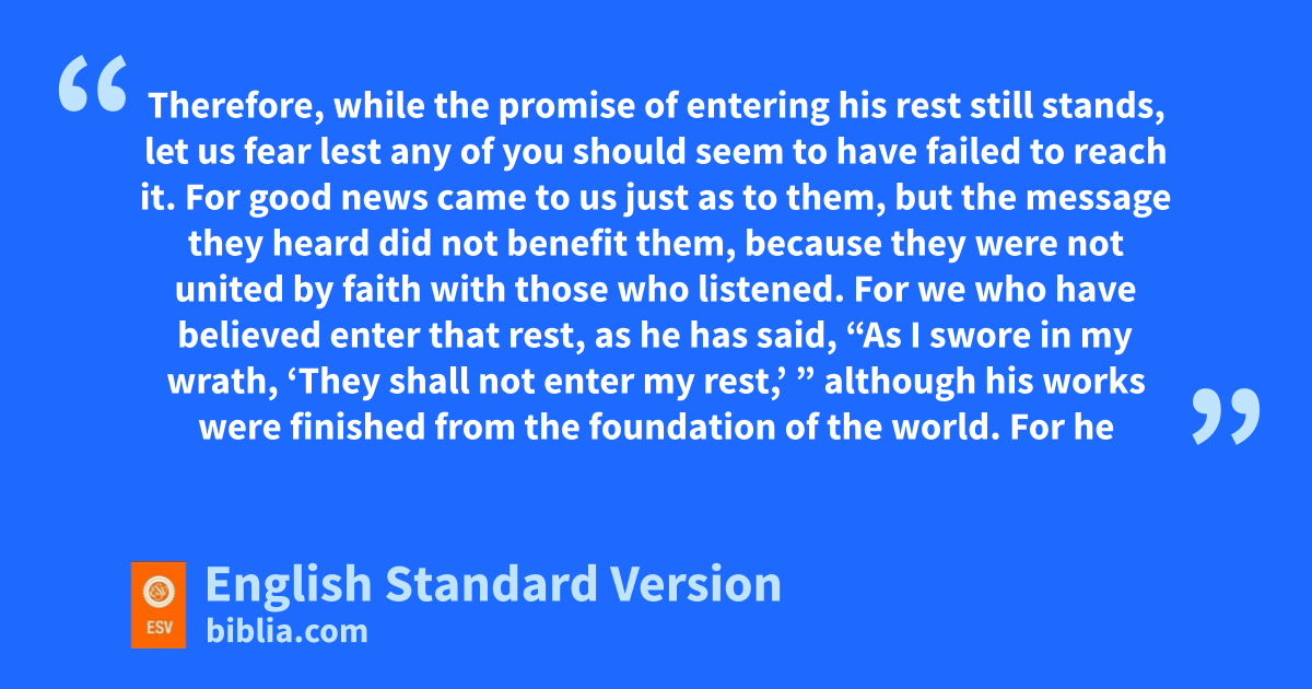 4 Therefore, while the promise of entering his rest still stands, let us fear lest any of you should seem nto have failed to reach it. 2 For good news came to us just as to them, but the message they heard did not benefit them, because othey were not united by faith with those who listened.1 3 For we who have believed enter that rest, as he has said,