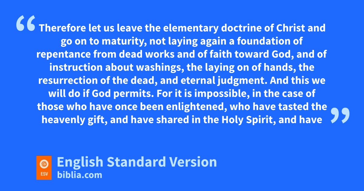 6 Therefore ilet us leave jthe elementary doctrine of Christ and go on to maturity, not laying again a foundation of repentance kfrom dead works and of faith toward God, 2 and of linstruction about washings,1 mthe laying on of hands, nthe resurrection of the dead, and oeternal judgment. 3 And this we will do pif God permits. 4 For it is impossible, in the case of those qwho have once been enlightened, who have tasted rthe heavenly gift, and shave shared in the Holy Spirit, 5 and thave tasted the goodness of the word of God and the powers of the age to come, 6 and uthen have fallen away, to restore them again to repentance, since vthey are crucifying once again the Son of God to their own harm and holding him up to contempt. 7 For wland that has drunk the rain that often falls on it, and produces a crop useful to those for whose sake it is cultivated, receives a blessing from God. 8 But xif it bears thorns and thistles, it is worthless and near to being cursed, yand its end is to be burned.