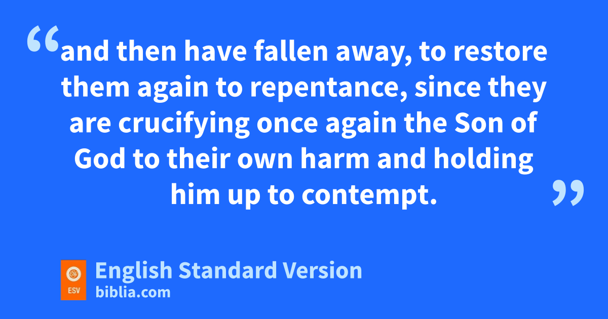 6 Therefore ilet us leave jthe elementary doctrine of Christ and go on to maturity, not laying again a foundation of repentance kfrom dead works and of faith toward God, 2 and of linstruction about washings,1 mthe laying on of hands, nthe resurrection of the dead, and oeternal judgment. 3 And this we will do pif God permits. 4 For it is impossible, in the case of those qwho have once been enlightened, who have tasted rthe heavenly gift, and shave shared in the Holy Spirit, 5 and thave tasted the goodness of the word of God and the powers of the age to come, 6 and uthen have fallen away, to restore them again to repentance, since vthey are crucifying once again the Son of God to their own harm and holding him up to contempt. 7 For wland that has drunk the rain that often falls on it, and produces a crop useful to those for whose sake it is cultivated, receives a blessing from God. 8 But xif it bears thorns and thistles, it is worthless and near to being cursed, yand its end is to be burned.