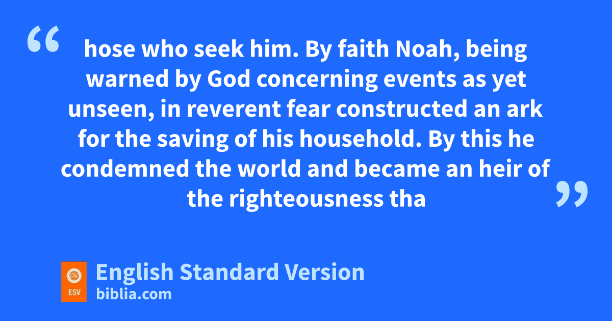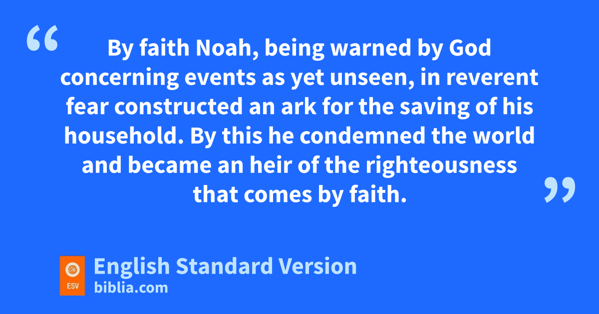 4 By faith hAbel offered to God ia more acceptable sacrifice than Cain, through which he was commended as righteous, God commending him by accepting his gifts. And jthrough his faith, though he died, he kstill speaks. 5 By faith lEnoch was taken up so that he should not see death, and he was not found, because God had taken him. Now before he was taken he was commended as having pleased God. 6 And without faith it is impossible to please him, for whoever would draw near to God mmust believe that he exists and mthat he rewards those who seek him. 7 By faith nNoah, being warned by God concerning oevents as yet unseen, in reverent fear constructed an ark for the saving of his household. By this he condemned the world and became an heir of pthe righteousness that comes by faith.