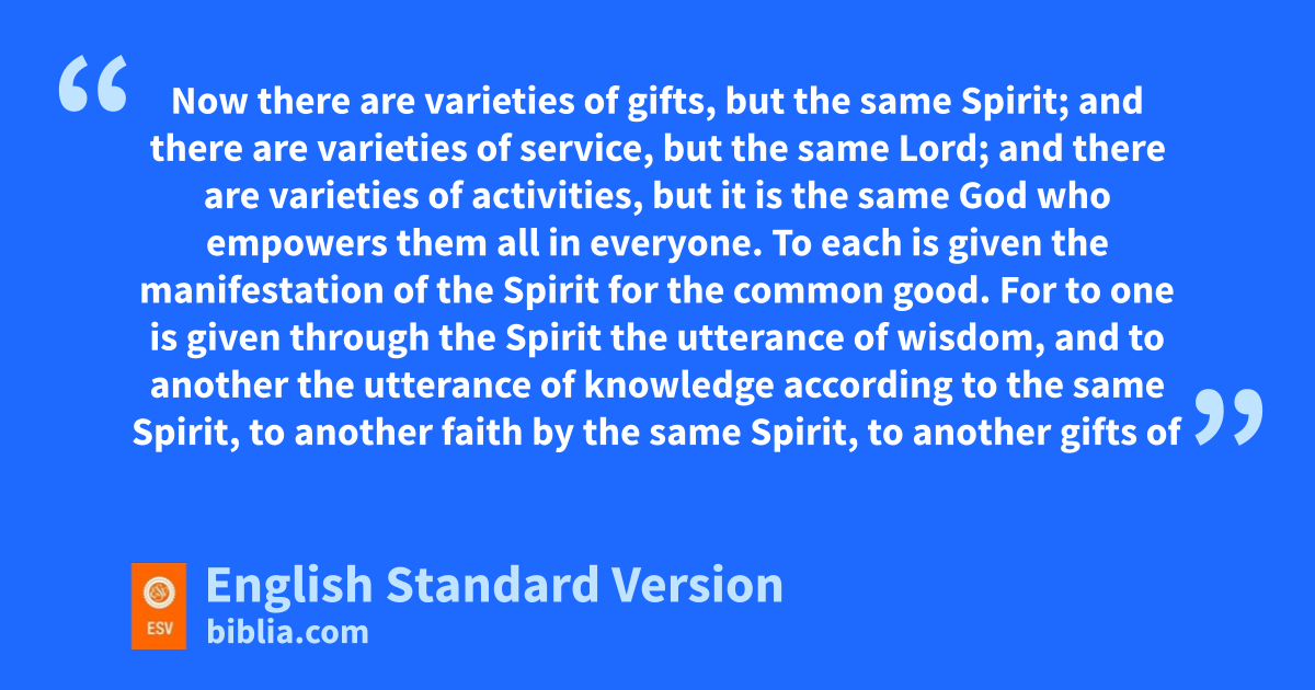 4 Now tthere are varieties of gifts, but uthe same Spirit; 5 and vthere are varieties of service, but uthe same Lord; 6 and there are varieties of activities, but it is uthe same God who empowers them all in everyone. 7 wTo each is given the manifestation of the Spirit for the common good. 8 For to one is given through the Spirit the utterance of xwisdom, and to another the utterance of yknowledge according to the same Spirit, 9 to another zfaith by the same Spirit, to another agifts of healing by the one Spirit, 10 to another bthe working of miracles, to another cprophecy, to another dthe ability to distinguish between spirits, to another evarious kinds of tongues, to another fthe interpretation of tongues. 11 All these are empowered by one and the same Spirit, gwho apportions to each one individually has he wills.