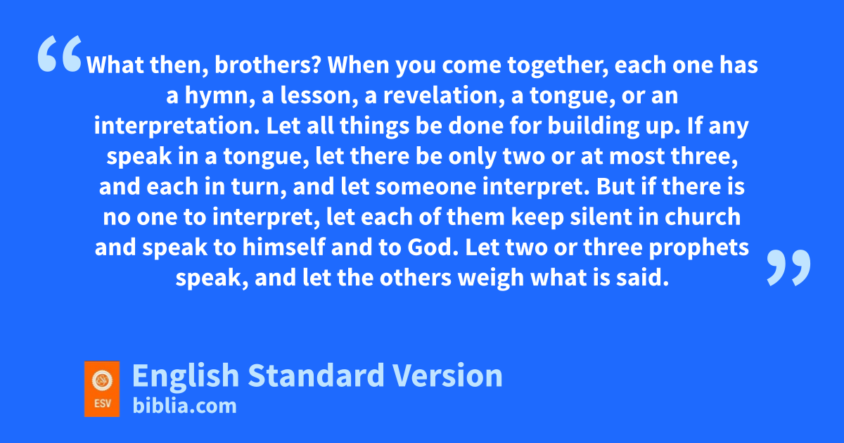 26 What then, brothers? When you come together, each one has qa hymn, ra lesson, ra revelation, sa tongue, or tan interpretation. uLet all things be done for building up. 27 If any speak in sa tongue, let there be only two or at most three, and each in turn, and let someone interpret. 28 But if there is no one to interpret, let each of them keep silent in church and speak to himself and to God. 29 Let two or three prophets speak, and let the others vweigh what is said. 30 If a revelation is made to another sitting there, wlet the first be silent. 31 For you can all prophesy one by one, so that all may learn and all be encouraged, 32 and the spirits of prophets are subject to prophets. 33 For God is not a God of xconfusion but of peace.