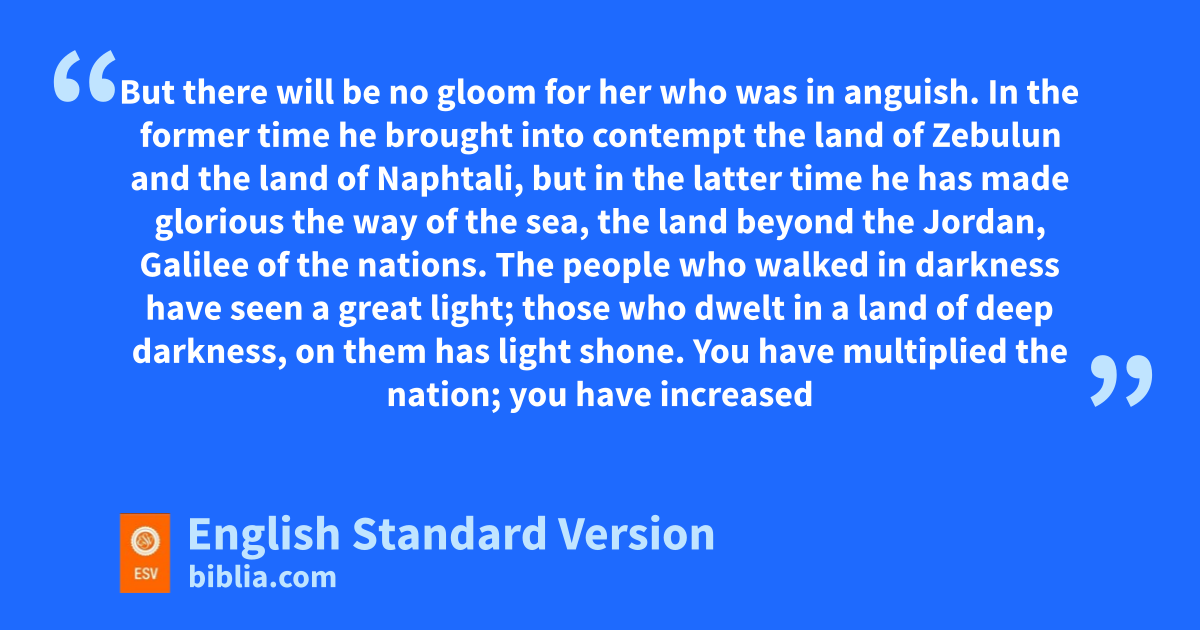 9 1 But there will be no ggloom for her who was in anguish. In the former time he hbrought into contempt the land of iZebulun and the land of Naphtali, but in the latter time he jhas made glorious the way of the sea, the land beyond the Jordan, Galilee of the nations.2