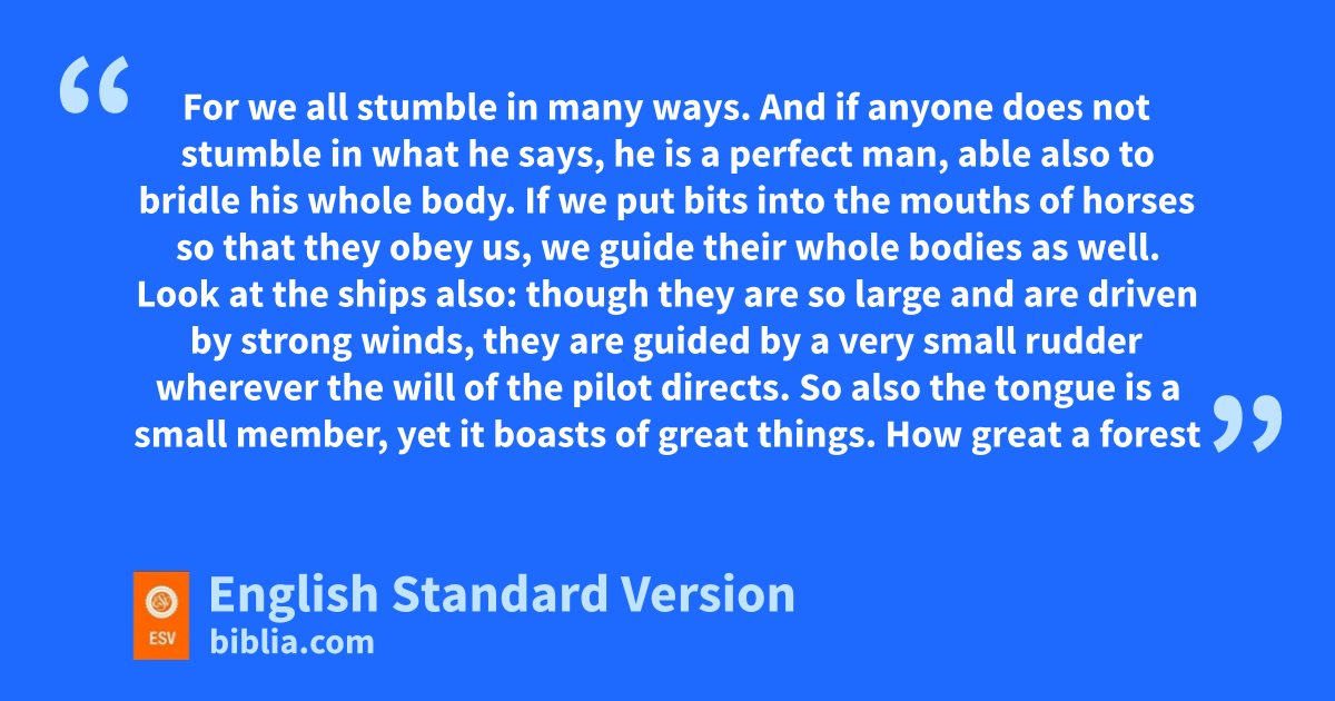3 cNot many of you should become teachers, my brothers, for you know that we who teach will be judged with greater strictness. 2 For dwe all stumble in many ways. And if anyone does not stumble in what he says, ehe is a perfect man, fable also to bridle his whole body. 3 If we put gbits into the mouths of horses so that they obey us, we guide their whole bodies as well. 4 Look at the ships also: though they are so large and are driven by strong winds, they are guided by a very small rudder wherever the will of the pilot directs. 5 So also the tongue is a small member, yet hit boasts of great things.
