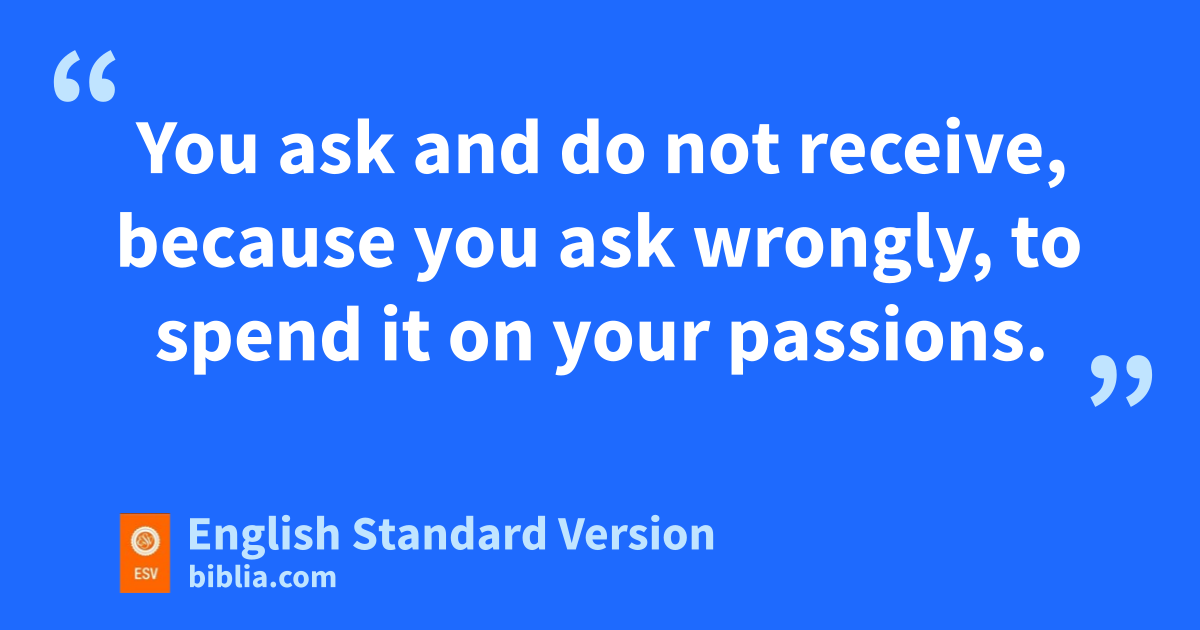 4 What causes quarrels and what causes fights among you? Is it not this, that your passions1 are yat war within you?2 2 You desire and do not have, so you murder. You covet and cannot obtain, so you fight and quarrel. You do not have, because you do not ask. 3 You ask and do not receive, because you ask zwrongly, to spend it on your passions. 4 aYou adulterous people!3 Do you not know that friendship with the world is enmity with God? bTherefore whoever wishes to be a friend of the world makes himself an enemy of God. 5 Or do you suppose it is to no purpose that the Scripture says, “He yearns jealously over the spirit cthat he has made to dwell in us”? 6 But dhe gives more grace. Therefore it says, e“God opposes the proud but dgives grace to the humble.” 7 Submit yourselves therefore to God. fResist the devil, and he will flee from you. 8 gDraw near to God, and he will draw near to you. hCleanse your hands, you sinners, and ipurify your hearts, jyou double-minded. 9 kBe wretched and mourn and weep. Let your laughter be turned to mourning and your joy to gloom. 10 lHumble yourselves before the Lord, and he will exalt you.