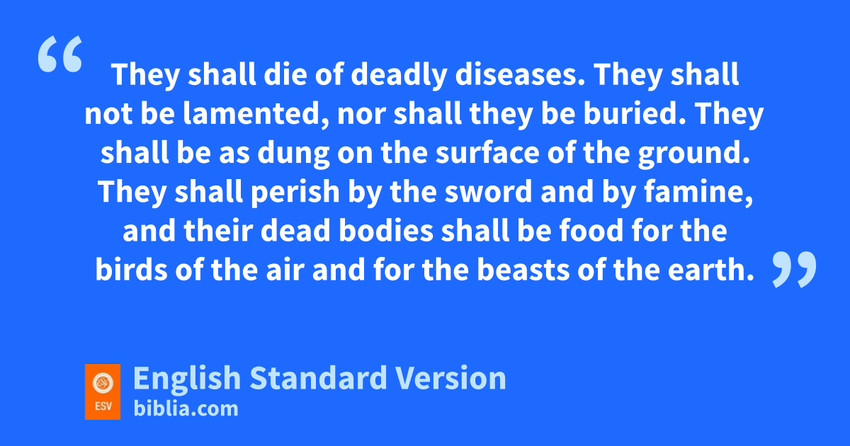 16 The word of the Lord came to me: 2 “You shall not take a wife, nor shall you have sons or daughters in this place. 3 For thus says the Lord concerning the sons and daughters who are born in this place, and concerning the mothers who bore them and the fathers who fathered them in this land: 4 jThey shall die of deadly diseases. kThey shall not be lamented, nor shall they be buried. lThey shall be as dung on the surface of the ground. mThey shall perish by the sword and by famine, nand their dead bodies shall be food for the birds of the air and for the beasts of the earth.