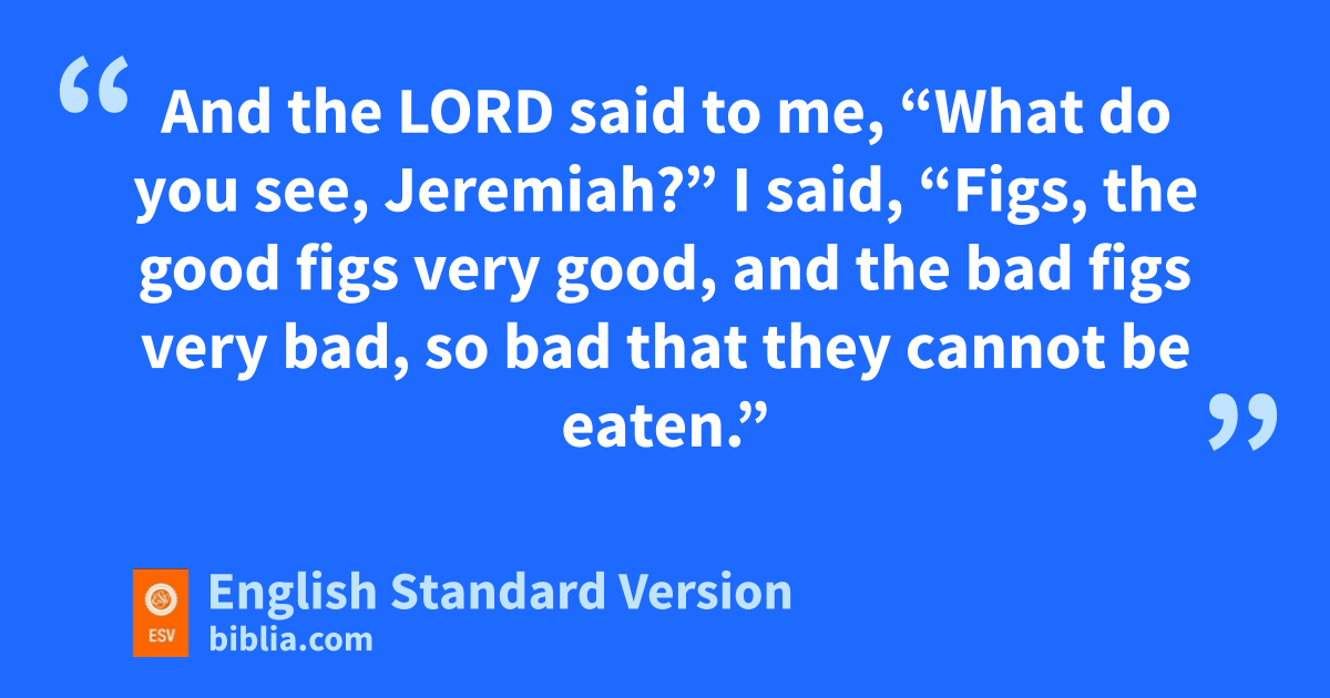 24 jAfter Nebuchadnezzar king of Babylon had taken into exile from Jerusalem kJeconiah the son of Jehoiakim, king of Judah, together with lthe officials of Judah, the craftsmen, and the metal workers, and had brought them to Babylon, the Lord showed me this vision: behold, mtwo baskets of figs placed before the temple of the Lord. 2 One basket had very good figs, nlike first-ripe figs, but the other basket had overy bad figs, so bad that they could not be eaten. 3 And the Lord said to me, “What do you see, Jeremiah?” I said, “Figs, the good figs very good, and the bad figs very bad, so bad that they cannot be eaten.”