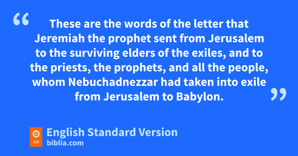 29 These are the words of the letter that Jeremiah the prophet sent from Jerusalem to ithe surviving elders of the exiles, and to jthe priests, jthe prophets, and jall the people, whom Nebuchadnezzar had taken into exile from Jerusalem to Babylon. 2 This was after kKing Jeconiah and the queen mother, the eunuchs, the officials of Judah and Jerusalem, the craftsmen, and the metal workers had departed from Jerusalem. 3 The letter was sent by the hand of Elasah the son of lShaphan and Gemariah the son of mHilkiah, whom Zedekiah king of Judah sent to Babylon to Nebuchadnezzar king of Babylon. It said: 4 “Thus says the Lord of hosts, the God of Israel, to all the exiles whom I have sent into exile from Jerusalem to Babylon: 5 nBuild houses and live in them; plant gardens and eat their produce. 6 Take wives and have sons and daughters; take wives for your sons, and give your daughters in marriage, that they may bear sons and daughters; multiply there, and do not decrease. 7 But seek the welfare of the city where I have sent you into exile, and opray to the Lord on its behalf, for in its welfare you will find your welfare. 8 For thus says the Lord of hosts, the God of Israel: pDo not let your prophets and qyour diviners who are among you deceive you, and do not listen to the dreams that they dream,1 9 for rit is a lie that they are prophesying to you in my name; sI did not send them, declares the Lord.