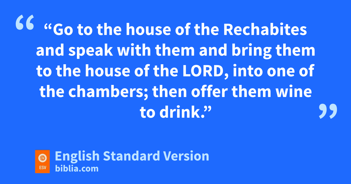 35 The word that came to Jeremiah from the Lord in the days of nJehoiakim the son of Josiah, king of Judah: 2 “Go to the house of the oRechabites and speak with them and bring them to the house of the Lord, into one of pthe chambers; then offer them wine to drink.” 3 So I took Jaazaniah the son of Jeremiah, son of Habazziniah and his brothers and all his sons and the whole house of the Rechabites. 4 I brought them to the house of the Lord into pthe chamber of the sons of Hanan the son of Igdaliah, qthe man of God, which was near pthe chamber of the officials, above pthe chamber of rMaaseiah the son of Shallum, skeeper of the threshold. 5 Then I set before the Rechabites pitchers full of wine, and cups, and I said to them, “Drink wine.” 6 But they answered, “We will drink no wine, for tJonadab the son of Rechab, our father, commanded us, ‘You shall not drink wine, neither you nor your sons forever. 7 You shall not build a house; you shall not sow seed; you shall not plant or have a vineyard; but you shall live in tents all your days, uthat you may live many days in the land where you sojourn.’ 8 We have obeyed the voice of Jonadab the son of Rechab, our father, in all that he commanded us, to drink no wine all our days, ourselves, our wives, our sons, or our daughters, 9 and not to build houses to dwell in. We have no vineyard or field or seed, 10 but we have lived in tents and have obeyed and done all that Jonadab our father commanded us. 11 But vwhen Nebuchadnezzar king of Babylon came up against the land, we said, ‘Come, and let us go to Jerusalem for fear of wthe army of the Chaldeans and wthe army of the Syrians.’ xSo we are living in Jerusalem.”