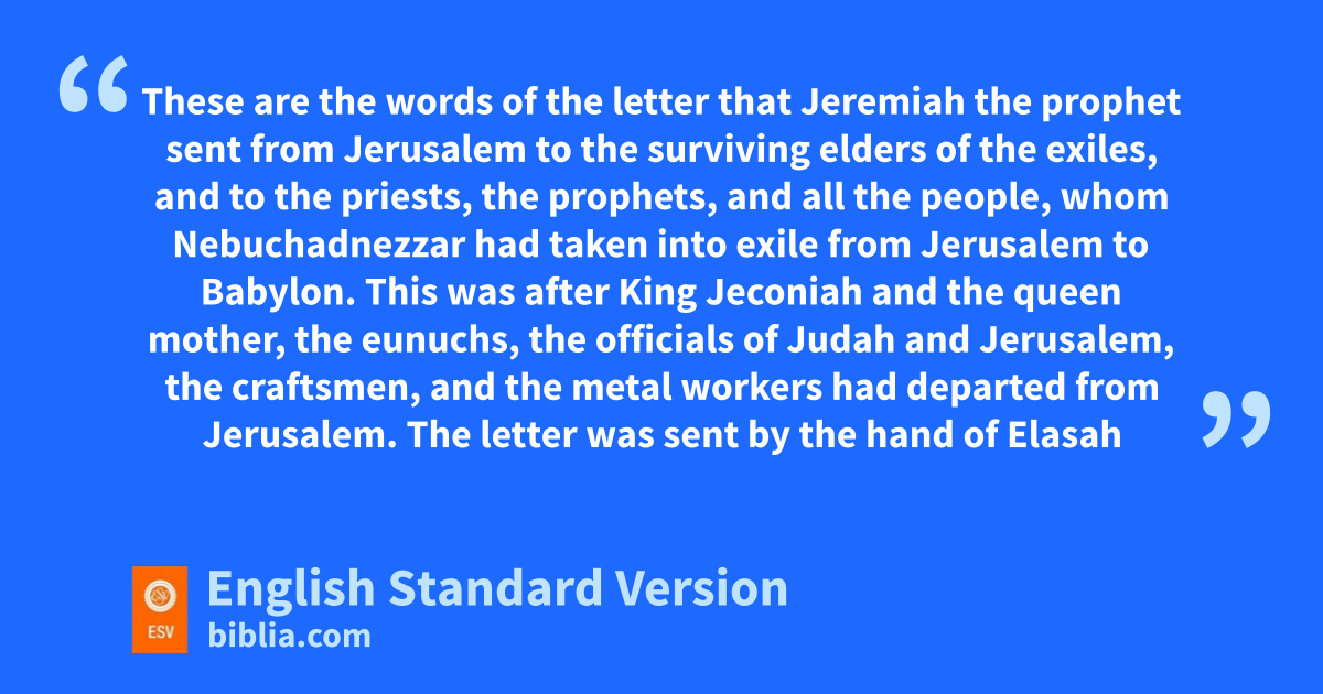 29 These are the words of the letter that Jeremiah the prophet sent from Jerusalem to ithe surviving elders of the exiles, and to jthe priests, jthe prophets, and jall the people, whom Nebuchadnezzar had taken into exile from Jerusalem to Babylon. 2 This was after kKing Jeconiah and the queen mother, the eunuchs, the officials of Judah and Jerusalem, the craftsmen, and the metal workers had departed from Jerusalem. 3 The letter was sent by the hand of Elasah the son of lShaphan and Gemariah the son of mHilkiah, whom Zedekiah king of Judah sent to Babylon to Nebuchadnezzar king of Babylon. It said: 4 “Thus says the Lord of hosts, the God of Israel, to all the exiles whom I have sent into exile from Jerusalem to Babylon: 5 nBuild houses and live in them; plant gardens and eat their produce. 6 Take wives and have sons and daughters; take wives for your sons, and give your daughters in marriage, that they may bear sons and daughters; multiply there, and do not decrease. 7 But seek the welfare of the city where I have sent you into exile, and opray to the Lord on its behalf, for in its welfare you will find your welfare. 8 For thus says the Lord of hosts, the God of Israel: pDo not let your prophets and qyour diviners who are among you deceive you, and do not listen to the dreams that they dream,1 9 for rit is a lie that they are prophesying to you in my name; sI did not send them, declares the Lord.